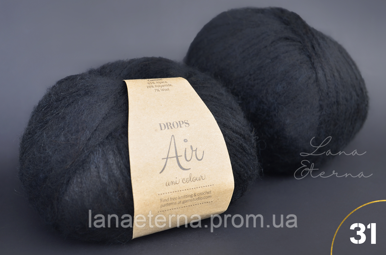 Drops Аir – назва говорить сама за себе – дуже повітряна пряжа, що забезпечує почуття комфорту для шкіри. Дані властивості пряжі Drops Аir роблять її ідеальною для одягу і аксесуарів (хустки, светри, кардигани) з візерунками і косами.